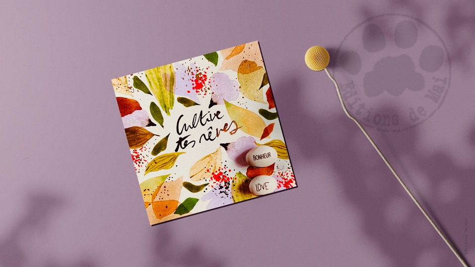 Carte à dorure 10,5×10,5 cm avec enveloppe sous céllophane et 2 graines gravées « Love » et « Bonheur ».